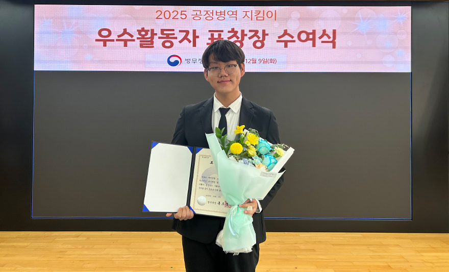 박병하 학생(국방디지털융합학과 2학년)은 지난 12월 ‘국방부 온라인 서포터즈’로서 활발히 활동한 점을 인정받아 국방부장관상을 받았다. 박병하 학생은 타 대학 학생 5명과 팀을 꾸려 2025년 4월부터 12월까지 서포터즈로 활동하면서, 국방 정책 및 현장과 관련한 다양한 콘텐츠를 제작했다. 활동한 서포터즈 가운데 최우수 활동팀으로 선정되어, 국방부장관상을 수상하게 됐다.